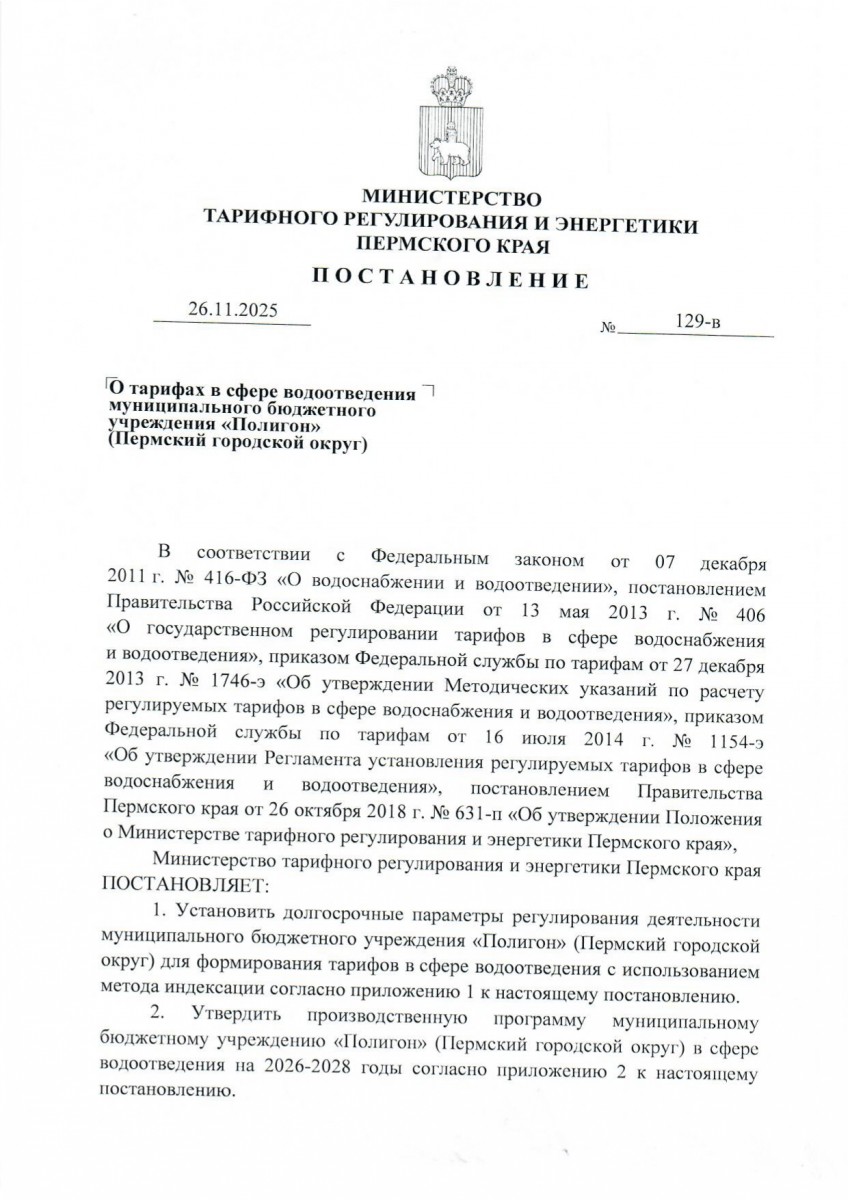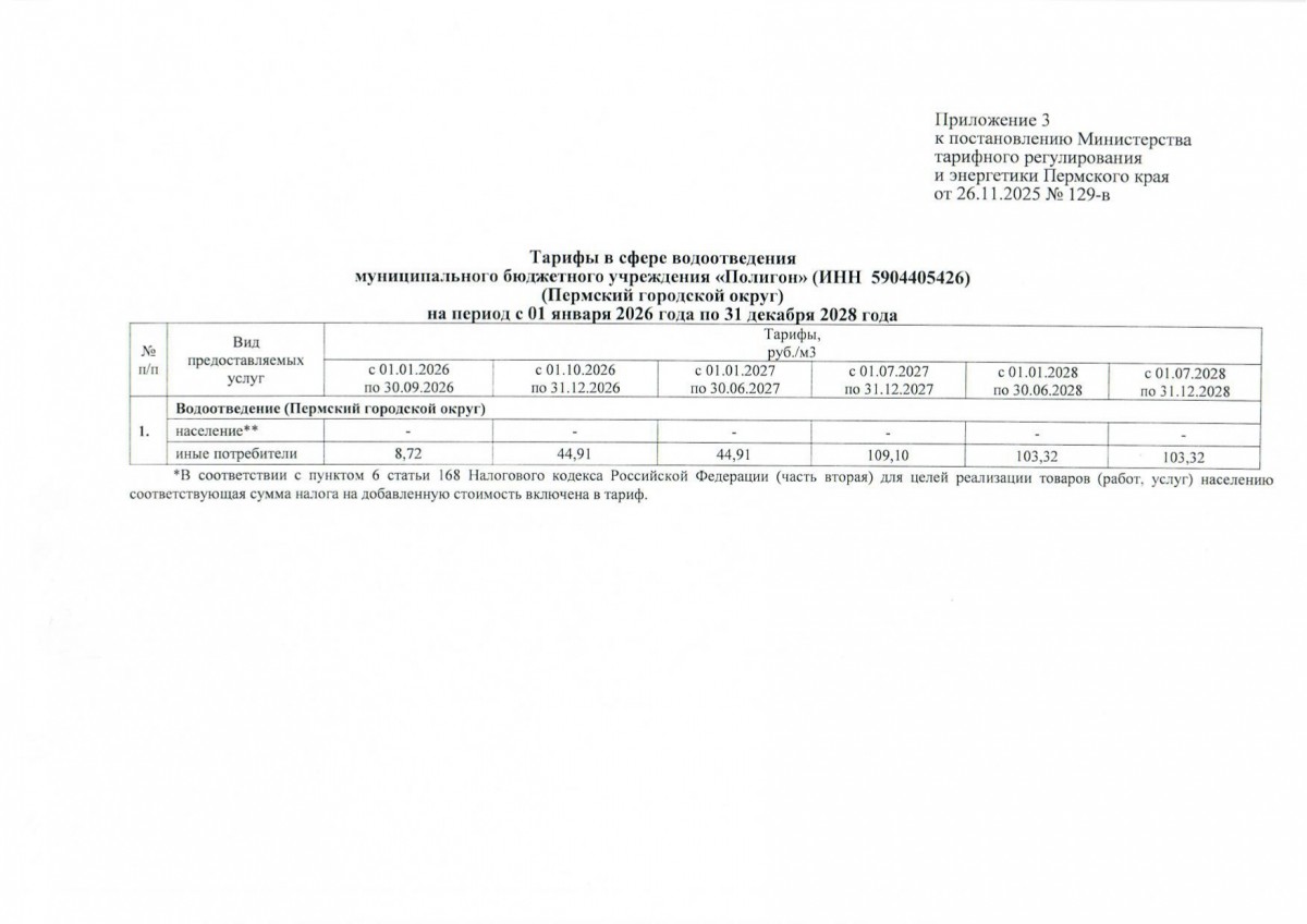 ВНИМАНИЕ! Опубликовано Постановление 129-в от 26.11.2025 о тарифе на ВО с 01.01.2026 г.03 декабря Важно! Обращаем Ваше внимание, что утвержденный тариф НЕ включает в себя НДС, НДС будет рассчитан СВЕРХУ! |