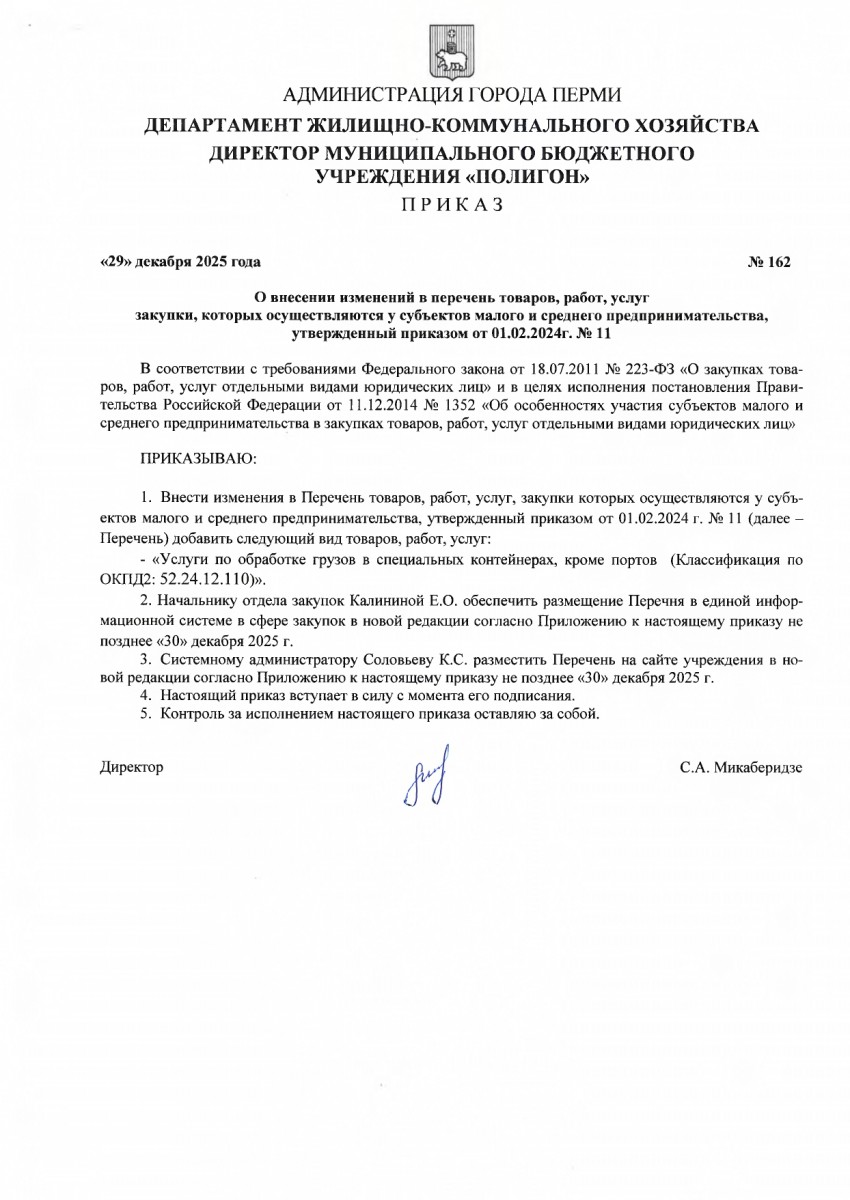 Опубликован Приказ № 162 о внесении изменений в перечень товаров, работ, услуг закупки, которых осуществляются у субъектов малого и среднего предпринимательства |