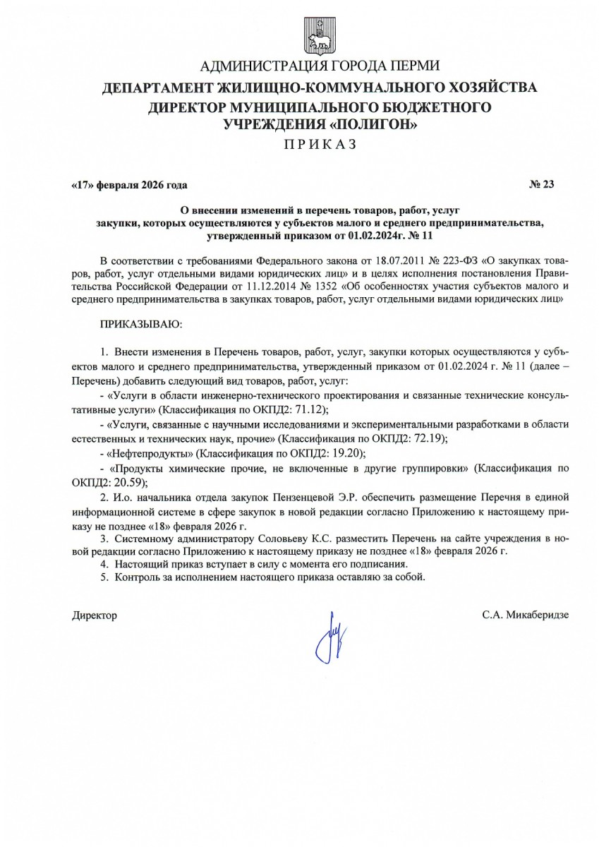 Опубликован Приказ № 23 о внесении изменений в перечень товаров, работ, услуг закупки, которых осуществляются у субъектов малого и среднего предпринимательства |